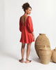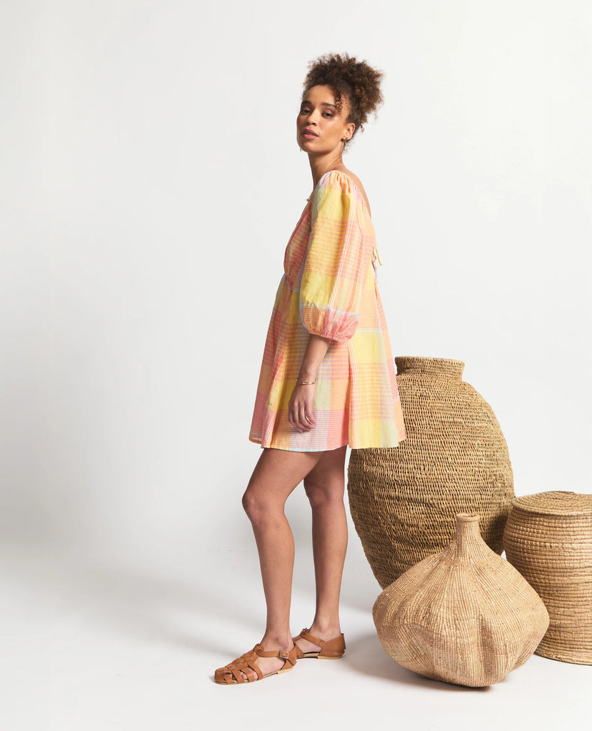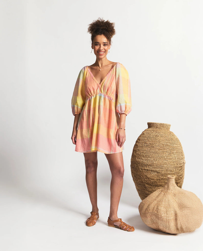 A romantic mini dress with a flattering flared A-line silhouette and V-neckline. Designed with gathered puff sleeves finished with elasticated hems, it adds just the right touch of volume. The low open back is framed with tie strings and a soft elastic detail, while the shaped front waist with gathers enhances the fit and flow.