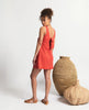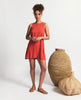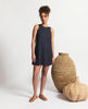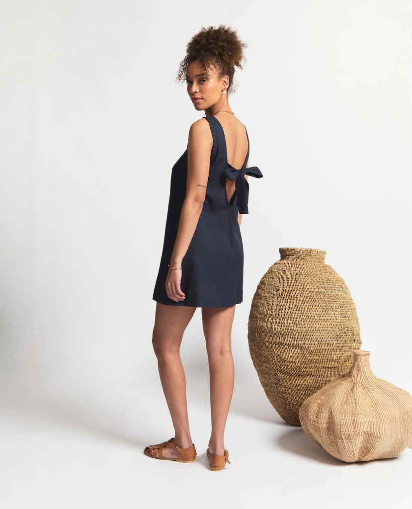 A chic mini dress with a clean round neckline and subtle bust darts for a flattering fit. The open back features a clever tie-up detail designed to cover a bra strap, combining ease with wearability. Finished in a classic A-line silhouette, it’s the perfect balance of playful and refined.