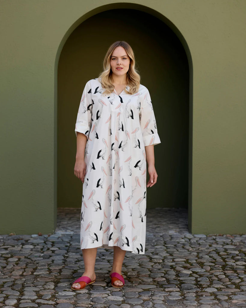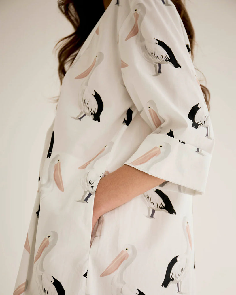 The Sardine Tunic Dress makes a splash with its bold v-neckline and relaxed, easy fit. Printed with a playful school of blue sardines and one bright red renegade, it’s a quirky standout wrapped in a breezy silhouette.