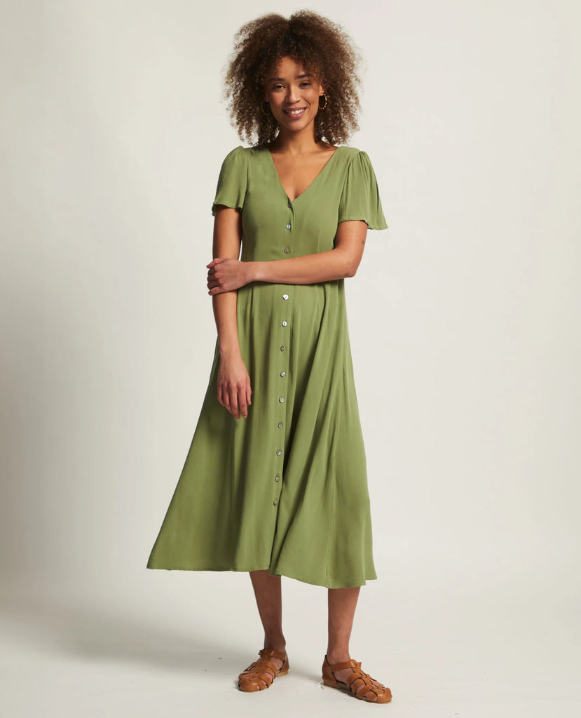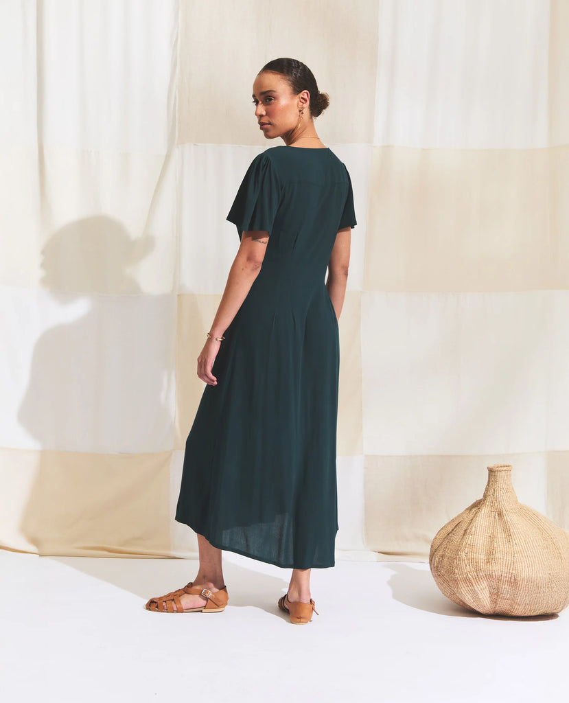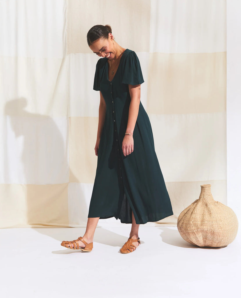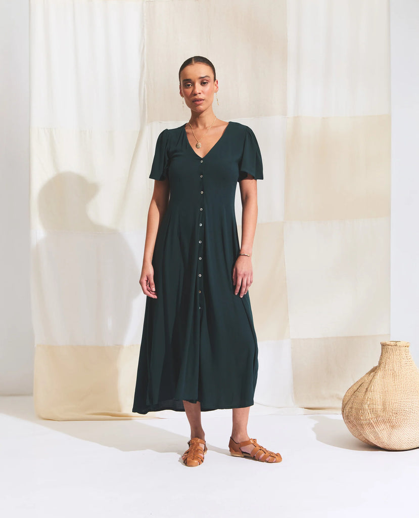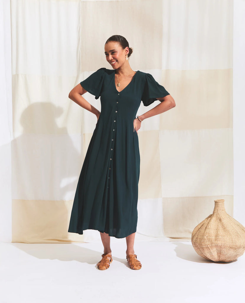A flowy V-neck button-down maxi dress designed for effortless elegance. Featuring delicate waist darts that create subtle shape, this relaxed-fit silhouette is finished with gathered flutter sleeves for a soft, feminine touch. Perfect for warm days and easy layering, it’s a versatile piece that moves beautifully with you.